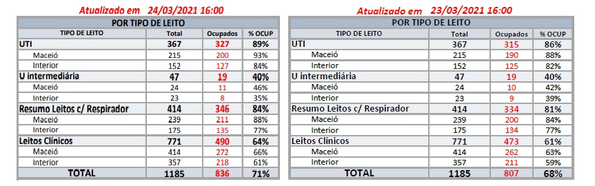O boletim aponta que houve 10 novas internações entre ontem e hoje na capital, saltando de 190 para 200 leitos de UTI ocupados, o que corresponde a 93% de ocupação. Segundo a atualização desta quarta-feira, restam em Maceió apenas 15 leitos de UTI vagos na rede pública estadual, que abrange também leitos contratualizados.