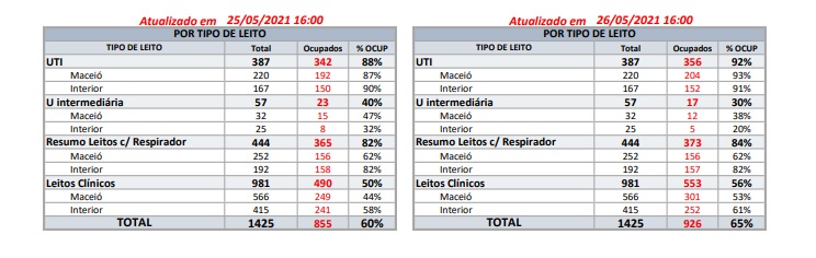 São 356 pessoas internadas em Alagoas, que dispõe de um total de 387 leitos de UTI. Em Maceió, o número de internados é de 204 para 220 leitos disponíveis, enquanto no interior são 152 pessoas em tratamento para 167 leitos. A ocupação de UTIs na capital e no interior é de 93% e 91% respectivamente.