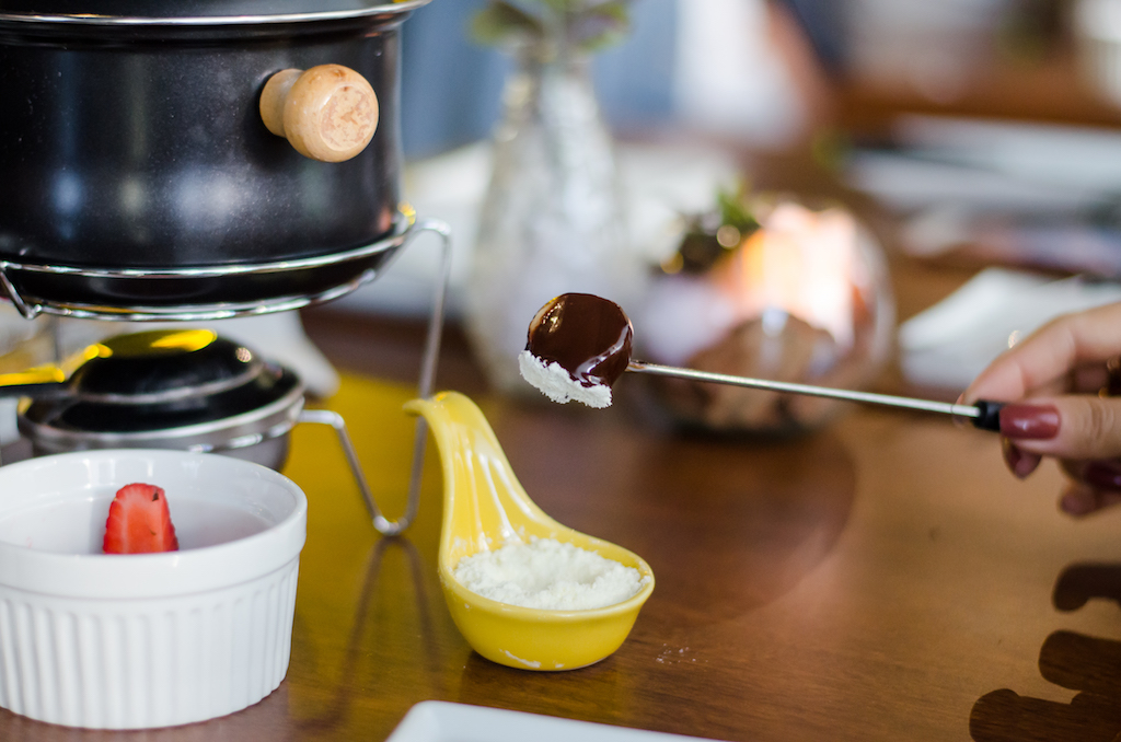 O fondue low carb é a grata surpresa do Festival de Inverno da Le Brulé. Ele não é muito doce, pois é feito com chocolate belga com 70% de cacau, óleo de coco e leite de amêndoas. Para mergulhar na panelinha da mistura de chocolate quente, frutas como uva, morango, damasco e banana.