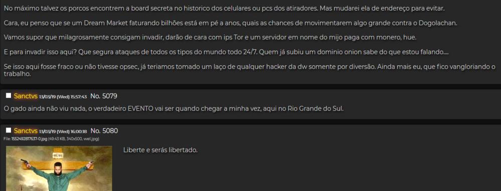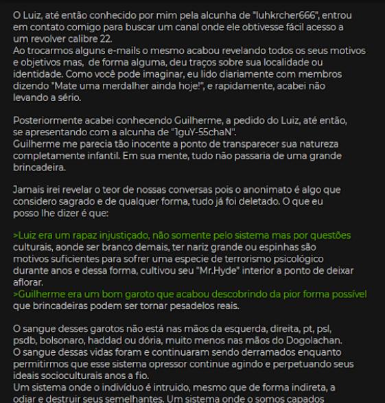 Na postagem, Lola fala sobre o massacre em Suzano e explica que o fórum anônimo foi criado em 2013 por Marcello Valle Silveira, pouco depois de sair da cadeia. No final do ano passado, ele foi condenado a 41 anos de prisão por associação criminosa, divulgação de imagens de pedofilia, racismo, coação, incitação ao cometimento de crimes e terrorismo cometidos na internet.