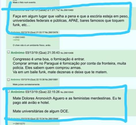 Eu tenho alguns prints que provam que o crime foi premeditado, planejado e anunciado no chan até cinco dias antes do acontecimento, e nenhuma ação da Delegacia de Crimes Virtuais ou da Polícia Federal foi tomada. No dia 7/3 o crime foi anunciado e o sinal de que eles estava prestes a acontecer seria uma música. No dia 11 a música Pumped Up Kicks (que fala sobre Columbine) foi postada junto com uma imagem de dois personagens, onde um deles usa a camiseta com os dizeres 'Natural Selection', a mesma camiseta que um dos atiradores usava no momento do massacre. O atentado ocorreu no dia 13, e o último print é a conversa que os usuários estavam tendo logo depois. Sei que você se importa em denunciar os crimes cometidos pelos chans e eu acho que eles não podem ficar de fora da discussão sobre essa tragédia.