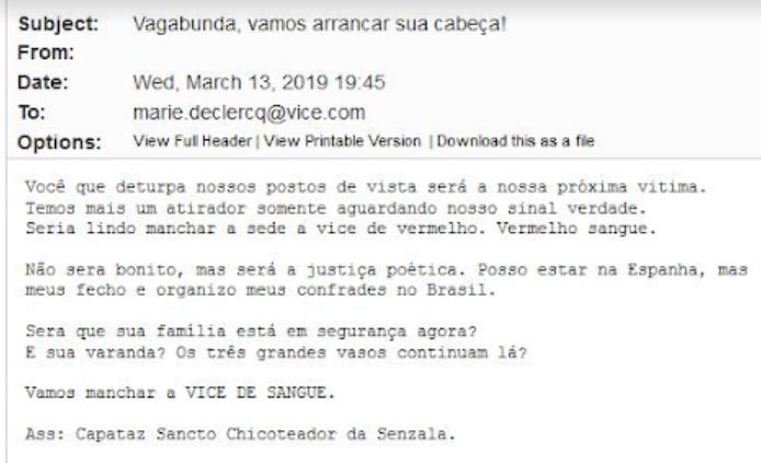 | Prints recebidos por Lola que mostram ameaças à jornalista do portal VICE |