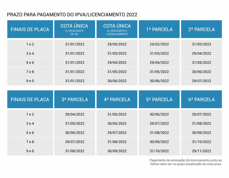 Cada final de placa possui uma data-limite para pagamento da cota única sem desconto ou da primeira parcela. As placas de finais 1 e 2 tiveram até 25 de fevereiro; placas de finais 3 e 4 vão ter até 31 de março; placas de finais 5 e 6 até 29 de abril; placas de finais 7 e 8 até 31 de maio e as placas de finais 9 e 0 até 30 de junho.