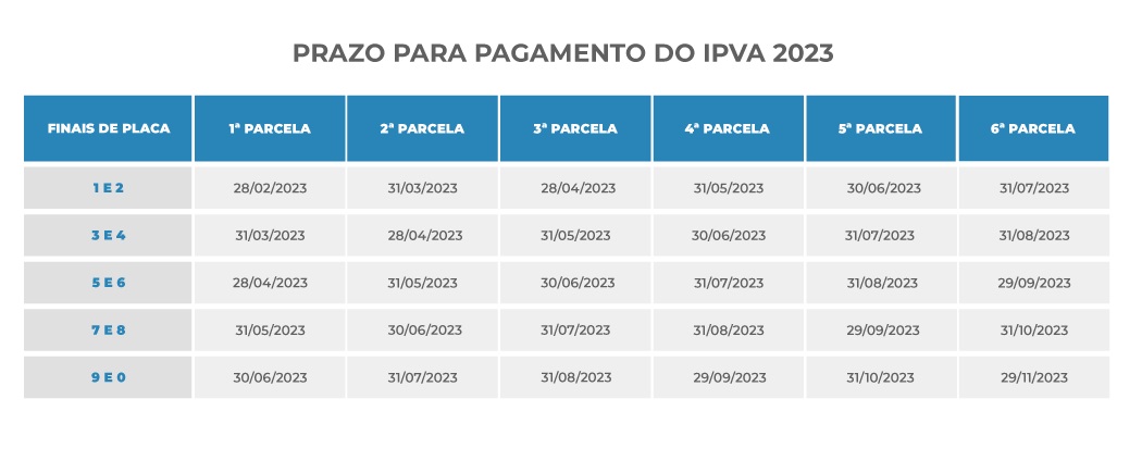 Cada final de placa possui uma data-limite para pagamento da cota única sem desconto ou da primeira parcela. As placas de finais 3 e 4 até 31 de março; placas de finais 5 e 6 até 28 de abril; placas de finais 7 e 8 até 31 de maio e as placas de finais 9 e 0 até 30 de junho.