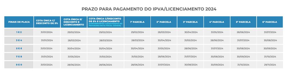 A tabela discriminativa de valor médio de mercado para veículos terrestres usados – base de cálculo – e prazos de pagamentos de IPVA para o exercício de 2024 podem ser vistos na publicação no Diário Oficial do Estado (DOE) do dia 26 de dezembro de 2023. Confira abaixo o calendário do imposto: