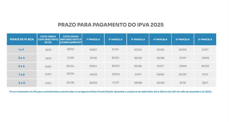 Cada final de placa possui uma data-limite para pagamento. Confira a tabela: