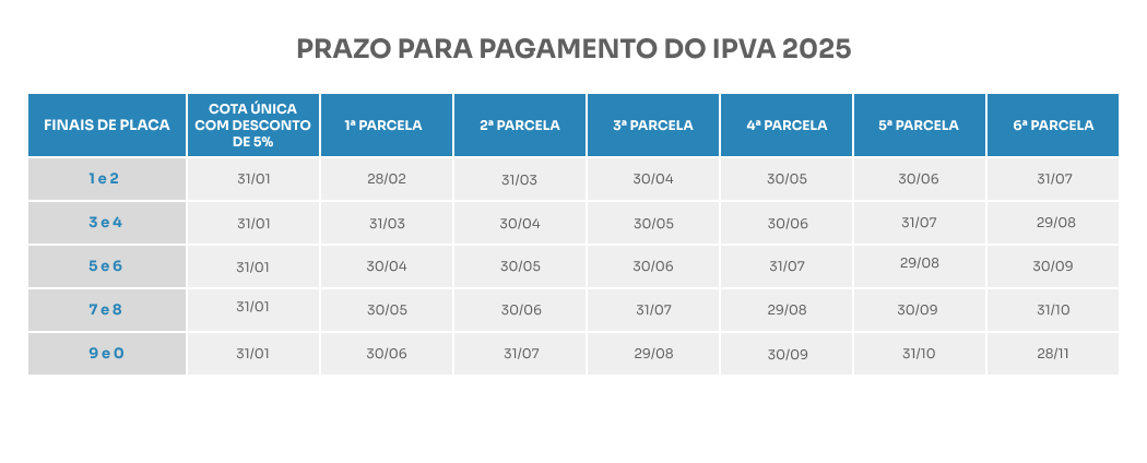 Cada final de placa possui uma data-limite para pagamento da cota única sem desconto, ou da primeira parcela. As placas de finais 1 e 2 têm até 28 de fevereiro; placas de finais 3 e 4, até 31 de março; placas de finais 5 e 6, até 30 de abril; placas de finais 7 e 8, até 30 de maio e as placas de finais 9 e 0, até 30 de junho.