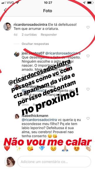 Nos comentários, ela também respondeu o moço, que foi super atacado por outros seguidores da modelo também! "Você queria que eu escondesse meu filho? Porque ele tem lábio leporino? Defeituosa é sua alma, seu cérebro! Provável que não tenha conserto!", escreveu ela.