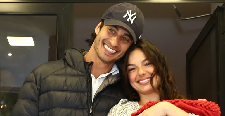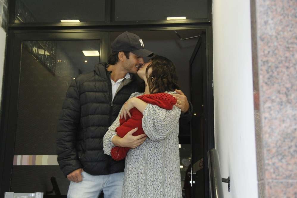 A mamãe de primeira viagem embala Rael com todo o seu amor e posa, com um sorrisão no rosto, para as fotos. André aproveitou para posar para os fotógrafos, dando um beijaço na esposa.