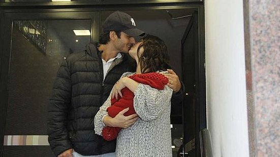 A mamãe de primeira viagem embala Rael com todo o seu amor e posa, com um sorrisão no rosto, para as fotos. André aproveitou para posar para os fotógrafos, dando um beijaço na esposa.