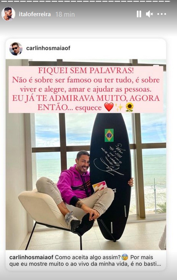 Carlinhos elogiou Ítalo, que é seu fã declarado e com quem ele se encontrou há alguns dias. "Máximo respeito e orgulho, continue sendo exemplo pra tantos jovens que sonham e têm você como referência, afinal andar sobre águas é divino!! Obrigado pela prancha, ainda sem jeito, mas prometo que vou 'tentar surfar'", brincou.
