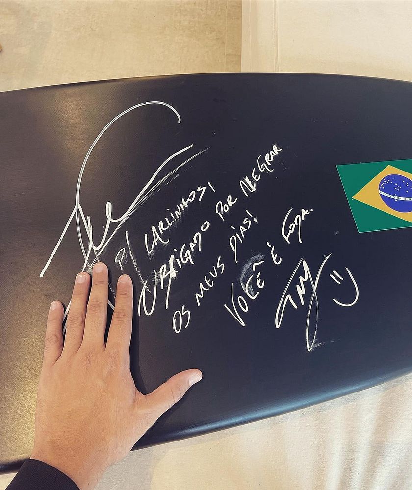 Ítalo Ferreira, o primeiro ouro no surfe nos Jogos Olímpicos, deu a prancha com o qual ganhou a história medalha em Tóquio para o humorista Carlinhos Maia. A novidade foi revelada pelo humorista em seu Instagram, nesta terça-feira (3), em um post emocionado, onde ele mesmo assumiu não acreditar merecer tamanha honra - "Para Carlinhos Maia, obrigada por alegrar meus dias. Você é foda", escreveu Ítalo na prancha.