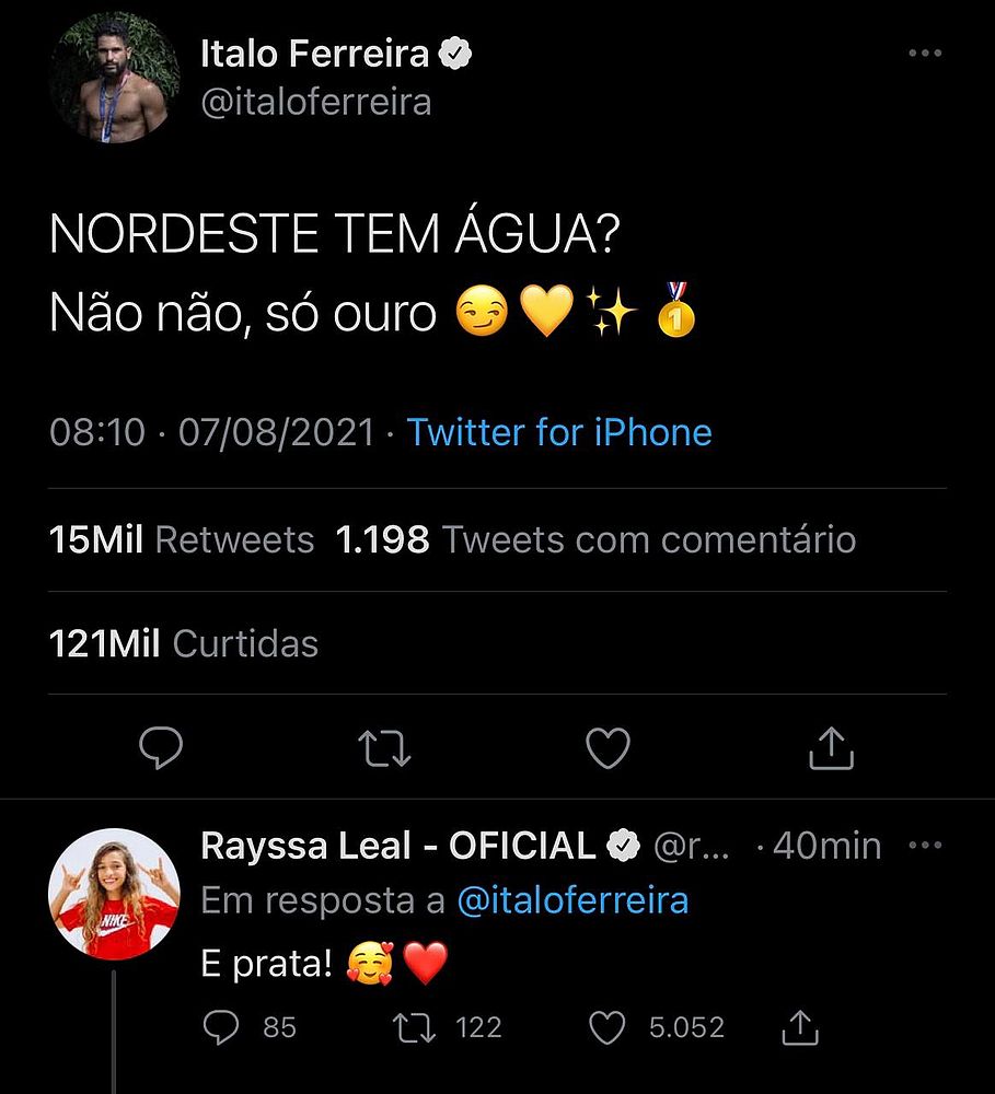 Rayssa Leal, a maranhense que ganhou a medalha de prata no skate street, também entrou na conversa e relembrou: "e prata". A internet foi à loucura.