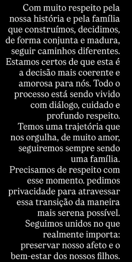 A artista lembrou a trajetória construída ao lado de Daniel Cady e afirmou que ambos continuarão sendo uma família. “Temos uma trajetória que nos orgulha, de muito amor”, disse. O comunicado ainda reforça o pedido por discrição: “Pedimos privacidade para atravessar essa transição da maneira mais serena possível”.