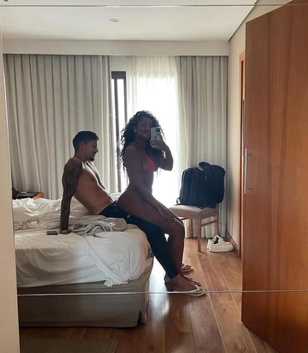 Na foto, o casal está no quarto, e Iza biquíni rosa, sentada no colo do atleta. Os dois sorriem para o clique feito no espelho. "ultimamente 🫀", escreveu na legenda. Seus seguidores reagiram.