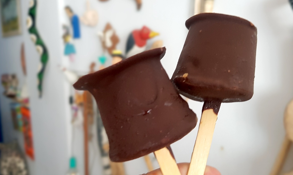 Picolés veganos de banana e paçoca, ambas com casquinha de chocolate