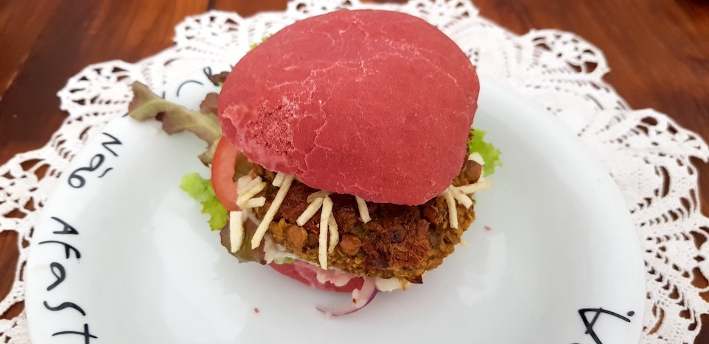 Grãos– A lentilha com quinoa também rende um ótimo hambúrguer no pão de beterraba com maionese temperada e catupiry, ambos veganos. No cardápio da gaúcha, os sabores do hambúrguer e do pão sempre variam.