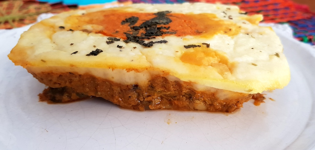 Escondidinho de shimeji com creme de macaxeira e feijão verde no leite de coco