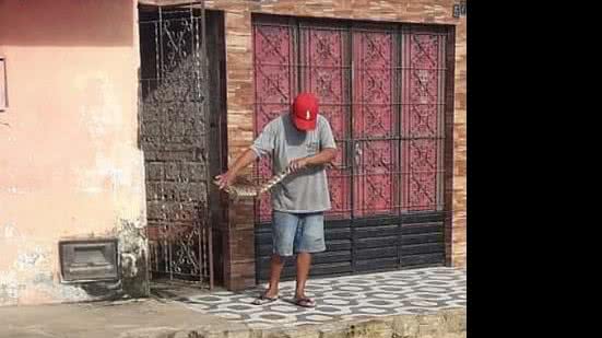 A imagem divulgada nas redes sociais mostra um homem segurando a boca e o rabo do réptil com as mãos. Ele teria se assustado ao se deparar com o bicho no cômodo do imóvel, mas conseguiu pegá-lo em seguida.