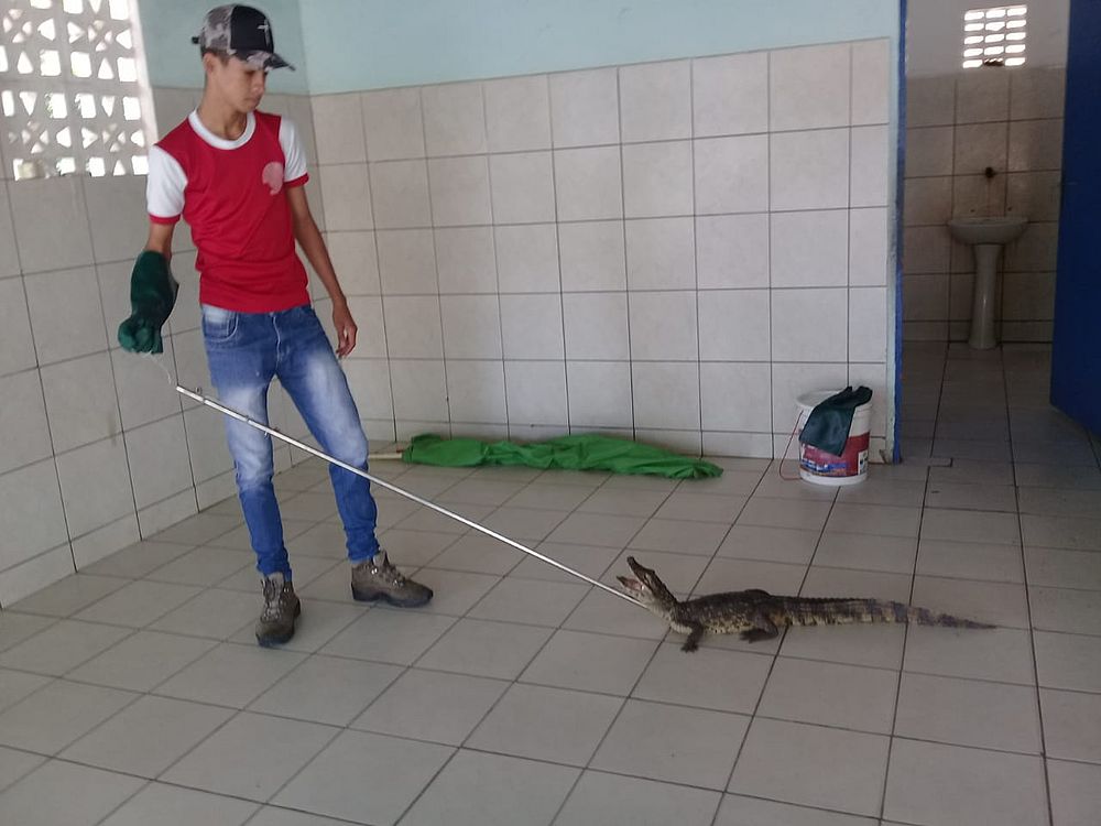 CORURIPE Na última terça-feira, 25, um jacaré foi encontrado no banheiro de uma escola pública no município de Coruripe. O animal foi resgatado pela equipe do Instituto Amigos da Natureza (Inan).