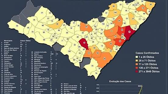Em relação à incidência dos óbitos por Covid-19 nos municípios alagoanos, Satuba mais uma vez lidera o ranking com uma taxa de 36,16 mortes por cada 100 mil habitantes, seguido por Campestre (28,84), Paulo Jacinto (26,44) e Jequiá da Praia (25,91). Maceió ocupa a nona colocação com 20,90 óbitos por cada 100 mil habitantes.