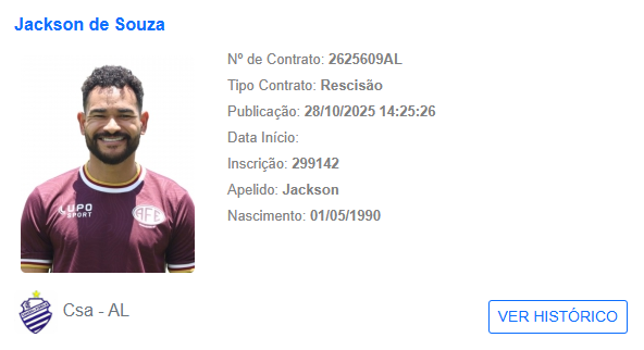 O zagueiro Jackson, que passou pelo CSA em 2025, entrou na Justiça do Trabalho cobrando rescisão contratual, salários atrasados e irregularidades no recolhimento do FGTS.