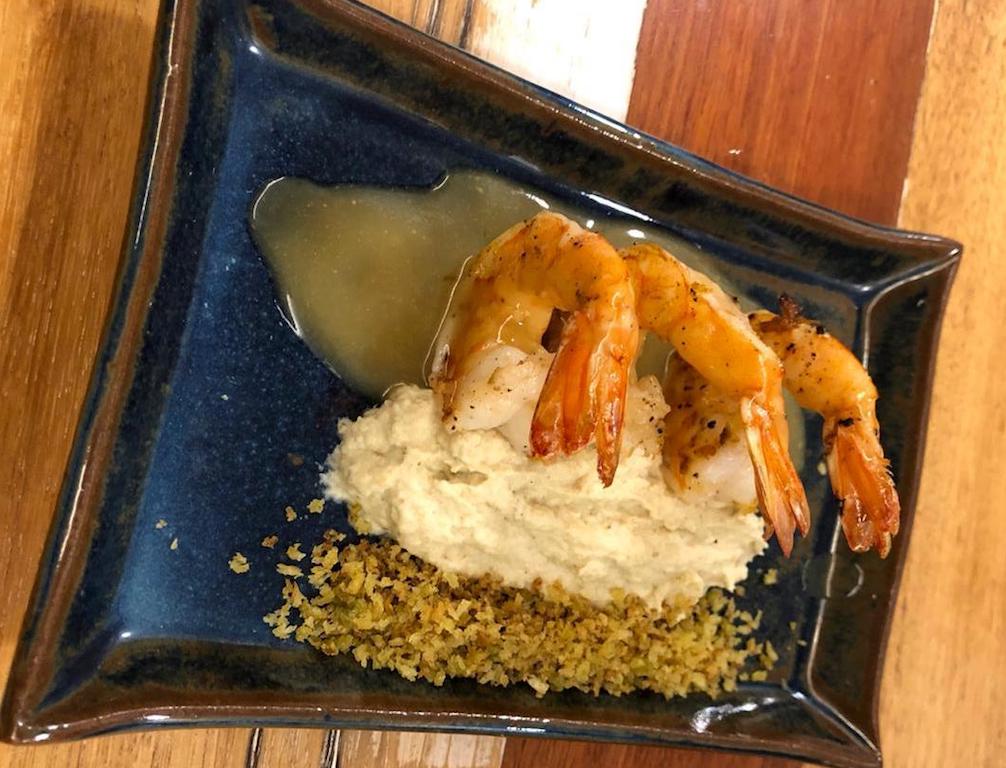 Primeiro prato: Camarão, molho de tucupi e laranja, purê de couve-flor e farofa panko de coentro