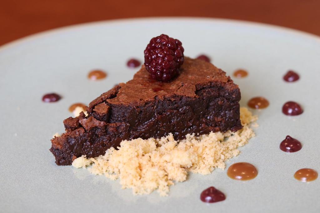 Sobremesa: Bolo de chocolate cremoso sem farinha, shortbread de coco e caramelo vermelho