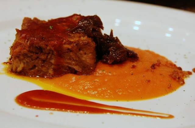 Costelinha suína desfiada com cebolas caramelizadas, purê de jerimum e molho barbecue. Comida nordestina com nova roupagem é a proposta do Chef Wanderson Medeiros no Club Lyon