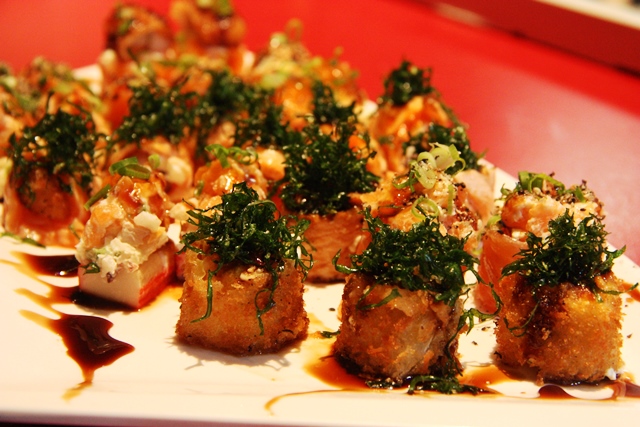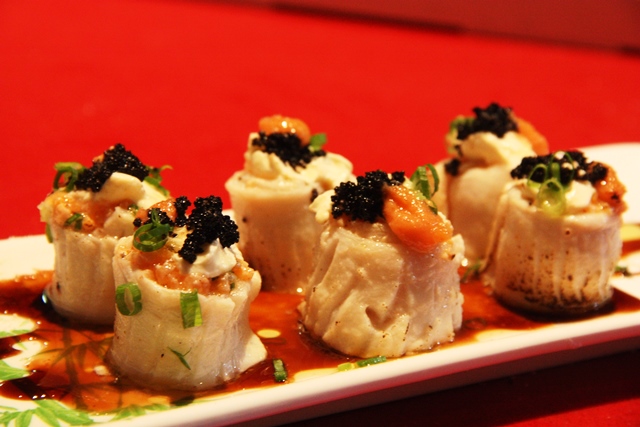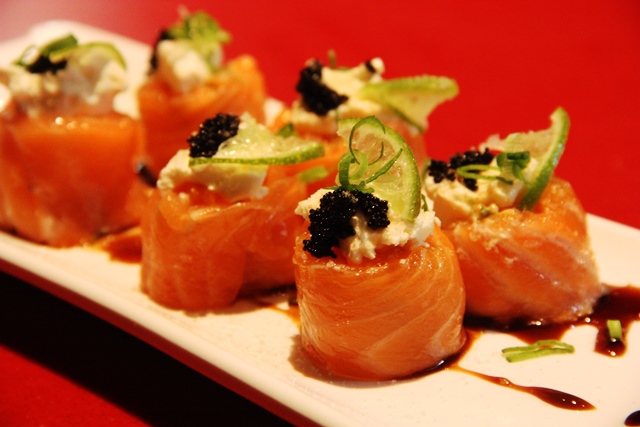 Enrolados – Salmão e agulhão são envolvidos e decorados com ovas de peixe voador, cream cheese e azeite defumado. Esta criação é Kukan (enrolado) Especial .