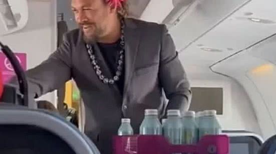 Jason Momoa, de 43 anos, famoso por ser protagonista no filme "Aquaman", fez um "bico" como comissário de bordo.