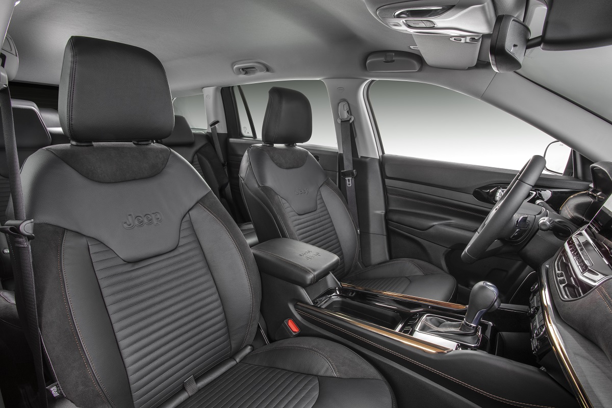 O logotipo da Jeep vem gravado em baixo relevo (versão Limited) no banco e no apoio de braço, que ainda traz o ano de fundação da marca (1941). Na Overland, o nome da versão é que vem gravado nos bancos.