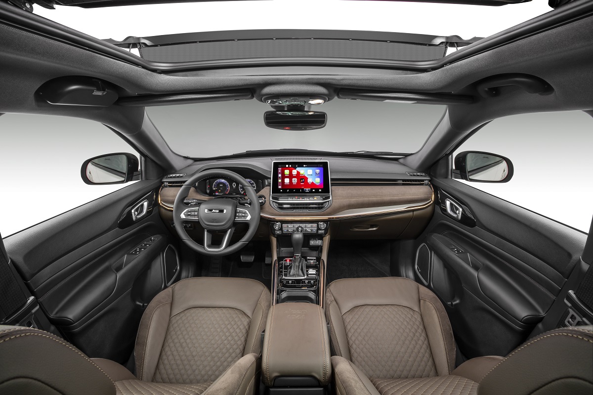Há ainda um filme decorativo hydrographic com acabamento metálico, que varia de acordo com o tom do interior: vertical brush com cromado cobre, silver metal brush com cromado e ainda vertical brush com cromado acetinado. A sofisticação é observada até mesmo nos badges externos do modelo como o nome do carro e logo Jeep. Eles trazem duplo acabamento em cromo acetinado e cobre.