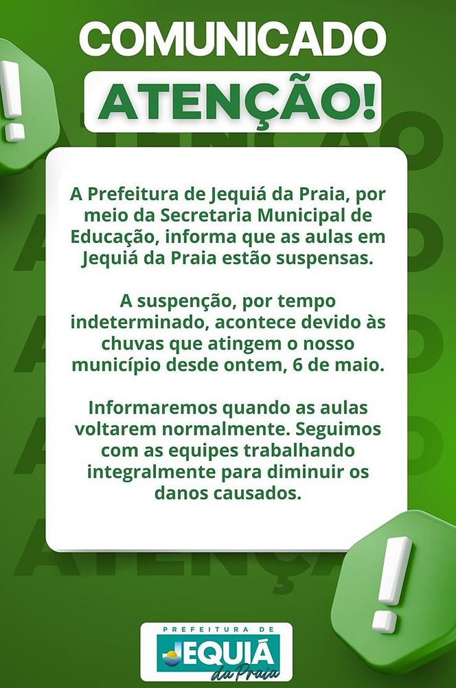 Também na manhã de hoje, a Secretaria Municipal de Educação de Jequiá da Praia informou que as aulas no município estão suspensas por tempo indeterminado. O órgão informou que a adoção da medida de prevenção é necessária para a segurança dos estudantes.
