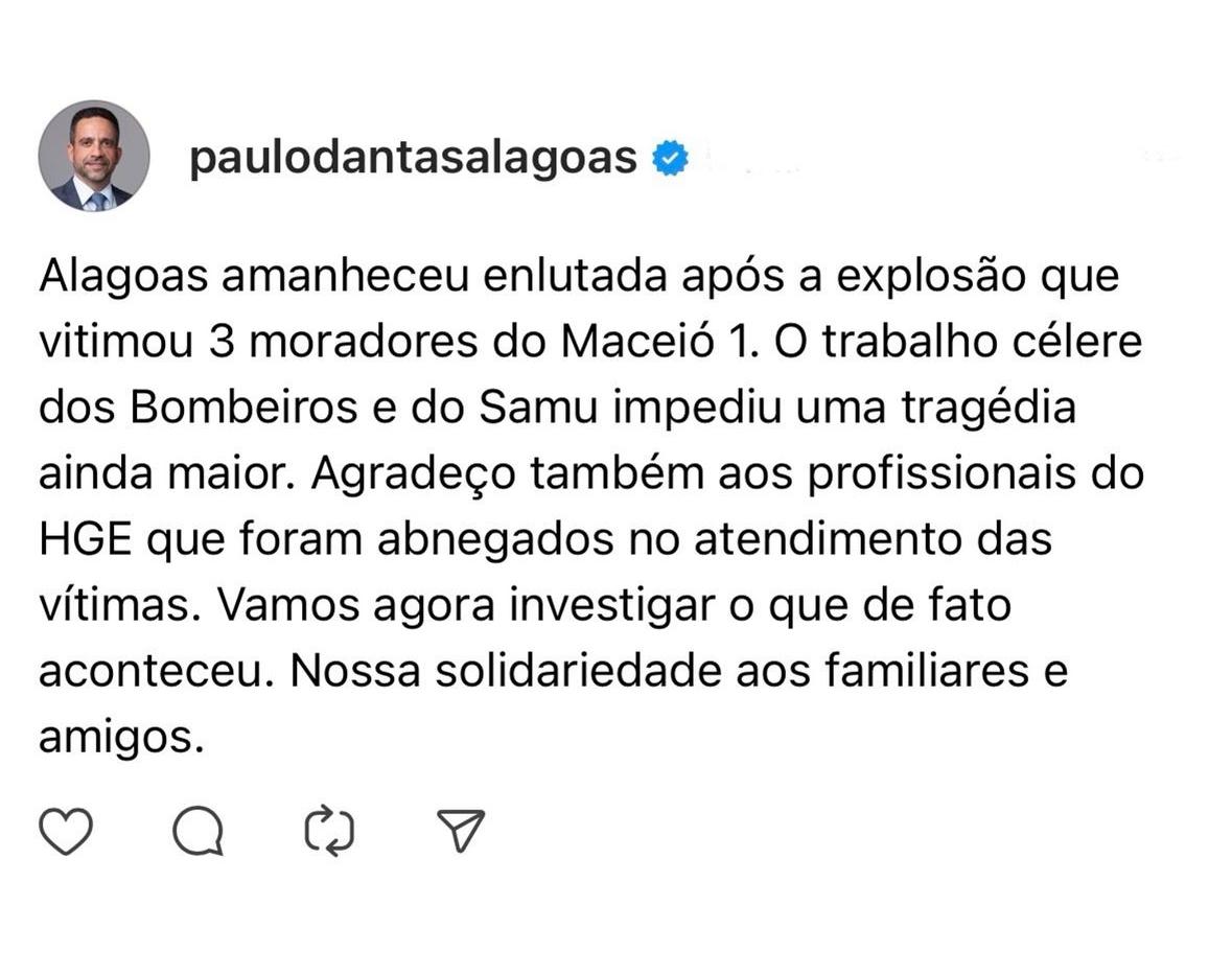 O governador Paulo Dantas (MDB), disse que o estado está em luto após a explosão e falou sobre o trabalho do Corpo de Bombeiros e do Serviço de Atendimento Médico de Urgência (Samu). "O trabalho célere dos Bombeiros e Samu impediu uma tragédia ainda maior. Agradeço também aos profissionais do HGE que foram abnegados no atendimento das vítimas. Nossa solidariedade aos familiares e amigos", disse o governador.