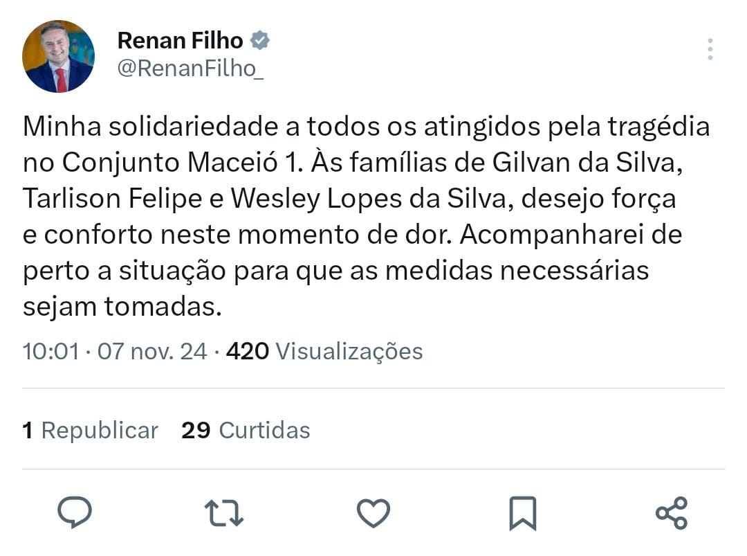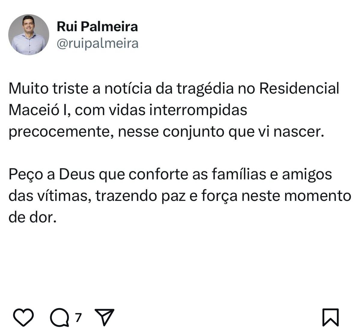 Em um post no X (antigo Twitter), JHC afirmou que a prefeitura está mobilizada para dar o suporte necessário aos afetados. “Minha solidariedade e orações estão com cada família atingida nessa tragédia no Residencial Maceió 1. Estamos todos da prefeitura mobilizados para dar suporte e acolhimento a quem precisa. Não mediremos esforços para amparar e cuidar do nosso povo”.