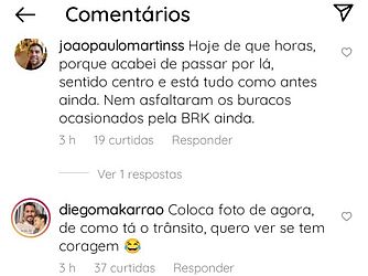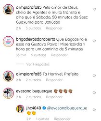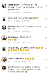 Mas claro, a população não perdoou, e encheu a postagem com diversos comentários se queixando da realidade não mostrada pelo gestor municipal. Houve quem pedisse ao prefeito que postasse "foto de agora", outros ironizando que as imagens pareciam de publicidade, "Parece até montagem de propagando de tão lindo", e um perguntando que horas as fotos foram tiradas "Hoje de que horas, porque acabei de passar por lá, sentido centro e está tudo como antes ainda. Nem asfaltaram os buracos ocasionados pela BRK ainda", queixou-se um internauta. Um terceiro comparou a situação aos congestionamentos na Índia. "Um caos! Está seguindo os padrões do trânsito indiano", brincou a internauta, mas em tom de queixa.