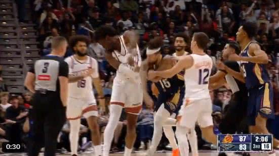 Alvarado, de 1,83m, foi quem primeiro puxou a camisa de Williams, que mede 2,16m. Armador dos Pelicans, Alvarado se irritou com a marcação do pivô do Suns, Williams.