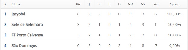 Com a goleada, o Jacyobá manteve a invencibilidade na competição e virou líder isolado. Já o Sete de Setembro se recuperou na disputa e empatou em número de pontos com o Porto Calvense. O São Domingos segue sem pontuar e amarga a lanterna.