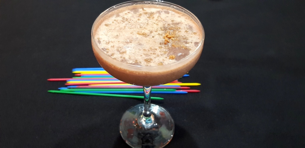 Don lud: licor Don Lud, sorvete de chocolate, Gin Santo Prazer e finalizado com paçoca