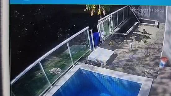 Nas imagens, o criminoso aparece de calça e blusa azul e com a cabeça coberta. Ele surge de uma área de mata e invade uma cerca de vidro, momentos antes de adentrar a parte interna da casa.
