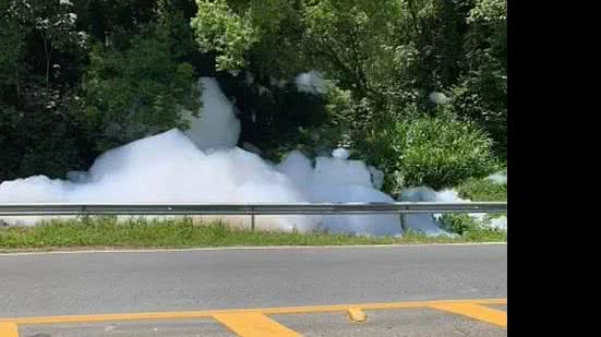 Imagens em redes sociais mostram o caminhão ignorando uma curva em alta velocidade e tombando na rodovia. Outras mostram a água do Cubatão coberta por uma espuma branca.