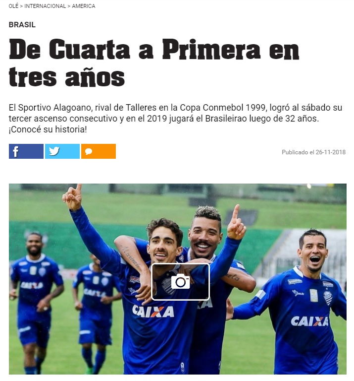 Na Argentina, o jornal "Olé" deu espaço para repercutir a conquista do CSA. O diário argentino relembrou que o Azulão foi rival do Talleres-ARG na final da Copa Conmebol em 1999 e destacou que o CSA volta a disputar a Série A do Campeonato Brasileiro após 32 anos. A reportagem citou o acesso na Série D (2016), o título brasileiro da Série C (2017) e mostrou a foto com imagem do técnico Luiz Felipe Scolari, a jogadora Marta e o compositor Eliezer Setton, a imagem em 3D utilizada pela torcida azulina no duelo contra o Avaí. O jornal explicou a história do trio com o CSA. O "Olé" detalhou ainda que os jogadores Leandro Souza, Rafinha e Didira subiram com o time nos três acessos seguidos.