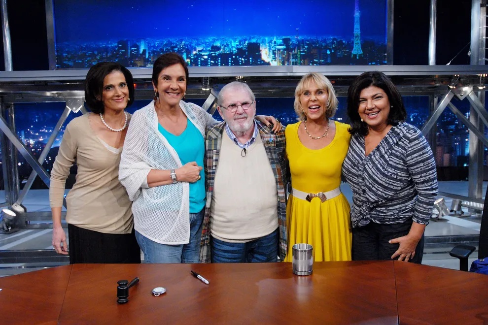 Lucia Hippolito ao lado de Jô Soares, Cris Lôbo, Lillian Witte Fibe e Ana Maria Tahan no 'Programa do Jô', em 2012 (Foto: Zé Paulo Cardeal / TV Globo)