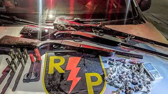 A polícia apreendeu: uma espingarda de calibre 12, de marca não identificada e com capacidade para um cartucho, contendo um intacto; uma arma da marca Rossi, com capacidade para um cartucho, sendo dois de calibre 12 e 10 calibre 32; e uma de marca e de calibre não identificados. A PM também recolheu 80 bombinhas de maconha e uma balança de precisão.