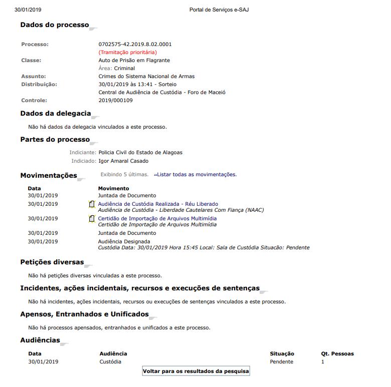 A assessoria de comunicação do TJ informou ao TNH1 na noite de hoje que Igor foi preso, na última terça-feira (29), acusado de posse ilegal de arma de fogo. A assessoria também informou que apenas na manhã desta quinta-feira (31), o juiz plantonista deve dar mais detalhes sobre o processo.