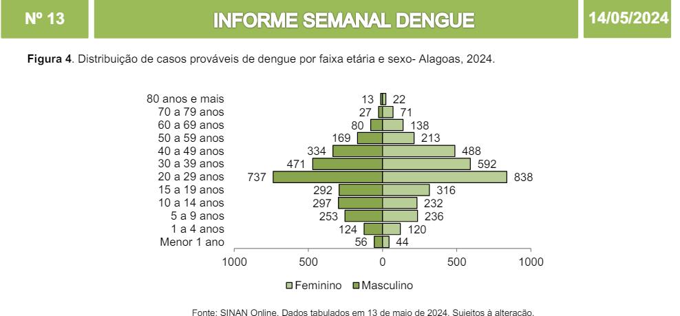 A maioria dos casos prováveis de dengue notificados em Alagoas em 2024 foram em pessoas com idades entre 20 e 29 anos. Os dados são do último boletim epidemiológico da Secretaria de Estado da Saúde de Alagoas (Sesau-AL), e foram divulgados nessa última terça-feira (14). O balanço mostra que 1.575 dos casos foram notificados no público jovem. Esse número representa mais de 25 % do total de casos prováveis de dengue notificados em todo o estado.