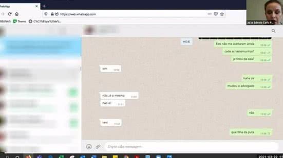 Enquanto a magistrada justificava suas razões de não aceitar a contestação da oitiva, o advogado, que estava compartilhando a tela do computador com todos na sala, escreve em uma conversa a frase "que filha da p...", no WhatsApp. A situação gerou constrangimento.
