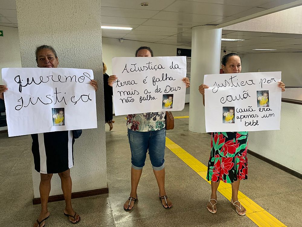 Os familiares presentes levaram cartazes com as frases "Queremos Justiça" e "Cauã era apenas um bebê". "Estamos esperando por justiça, mas se ela falhar, a de Deus não falha, não", continuou a avó.