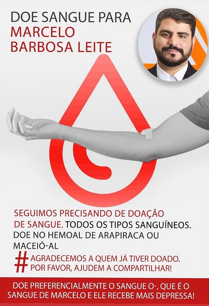 Família pede doação de sangue para empresário - Familiares de Marcelo Barbosa Leite iniciaram uma campanha nas redes sociais (veja abaixo) pedindo doação de sangue para o empresário. Segundo os familiares, o pedido é preferencialmente para o tipo sanguíneo O-, que é o sangue de Marcelo.